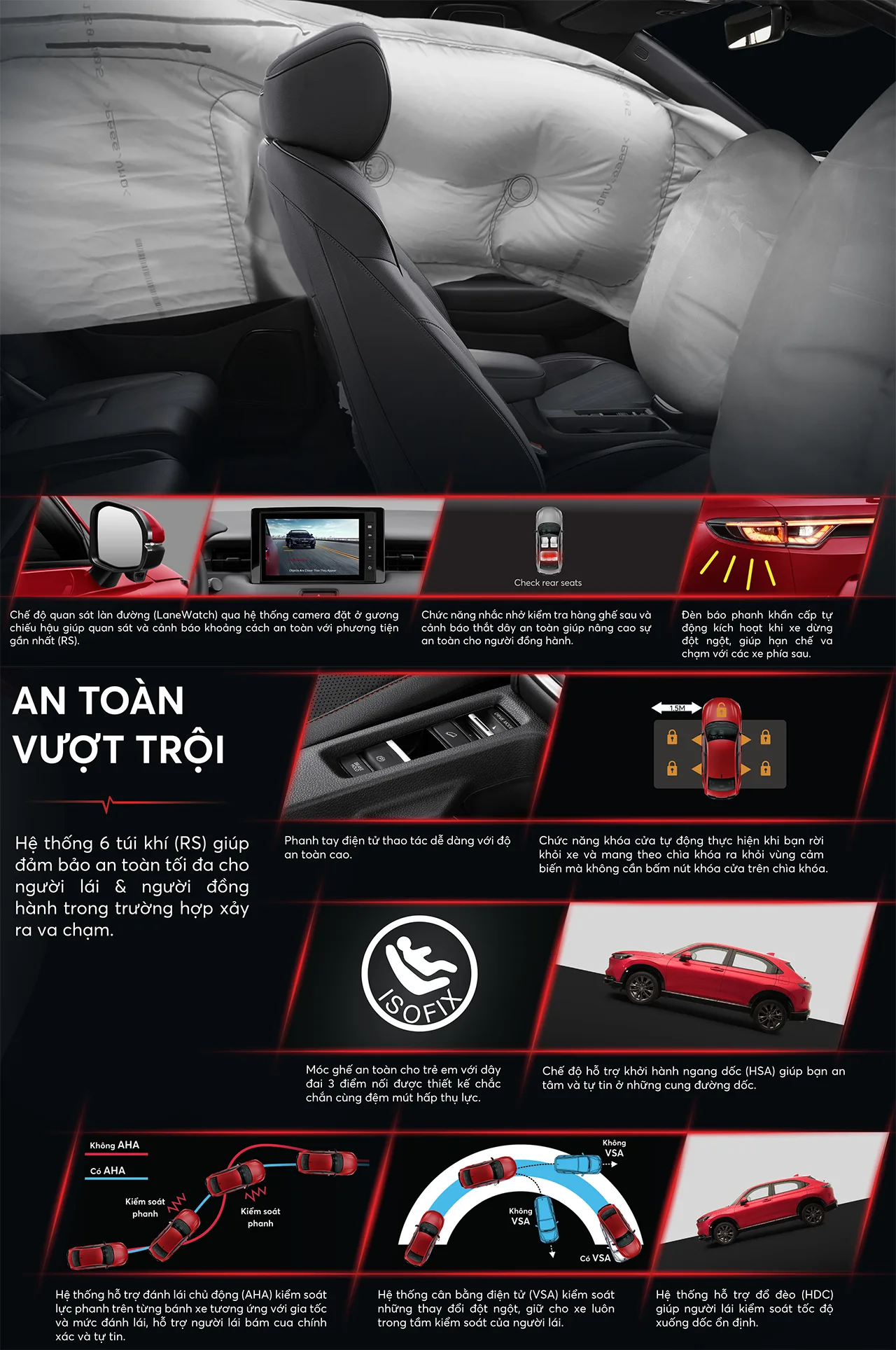 Honda HR-V mang đến sự vững tâm lái xe chinh phục hành trình. Hệ thống công nghệ thông minh hỗ trợ quan sát mọi tình huống, đồng thời điều chỉnh chế độ phù hợp nhằm bảo đảm an toàn cho người trong xe