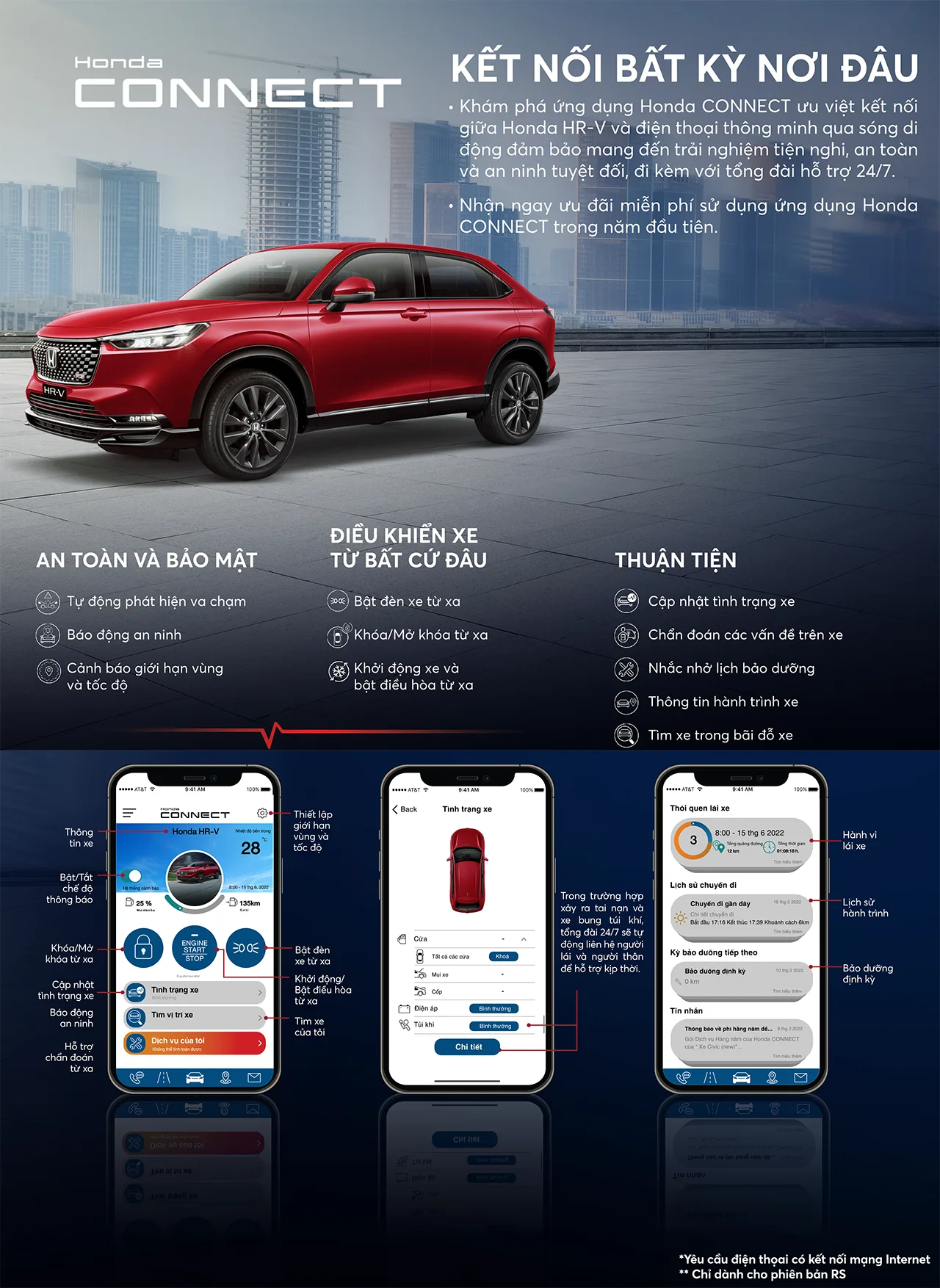 Khám phá ứng dụng Honda CONNECT ưu việt kết nối giữa xe Honda* và điện thoại thông minh qua sóng di động, đảm bảo mang đến trải nghiệm tiện nghi, an toàn và an ninh tuyệt đối, đi kèm với tổng đài hỗ trợ 24/7.