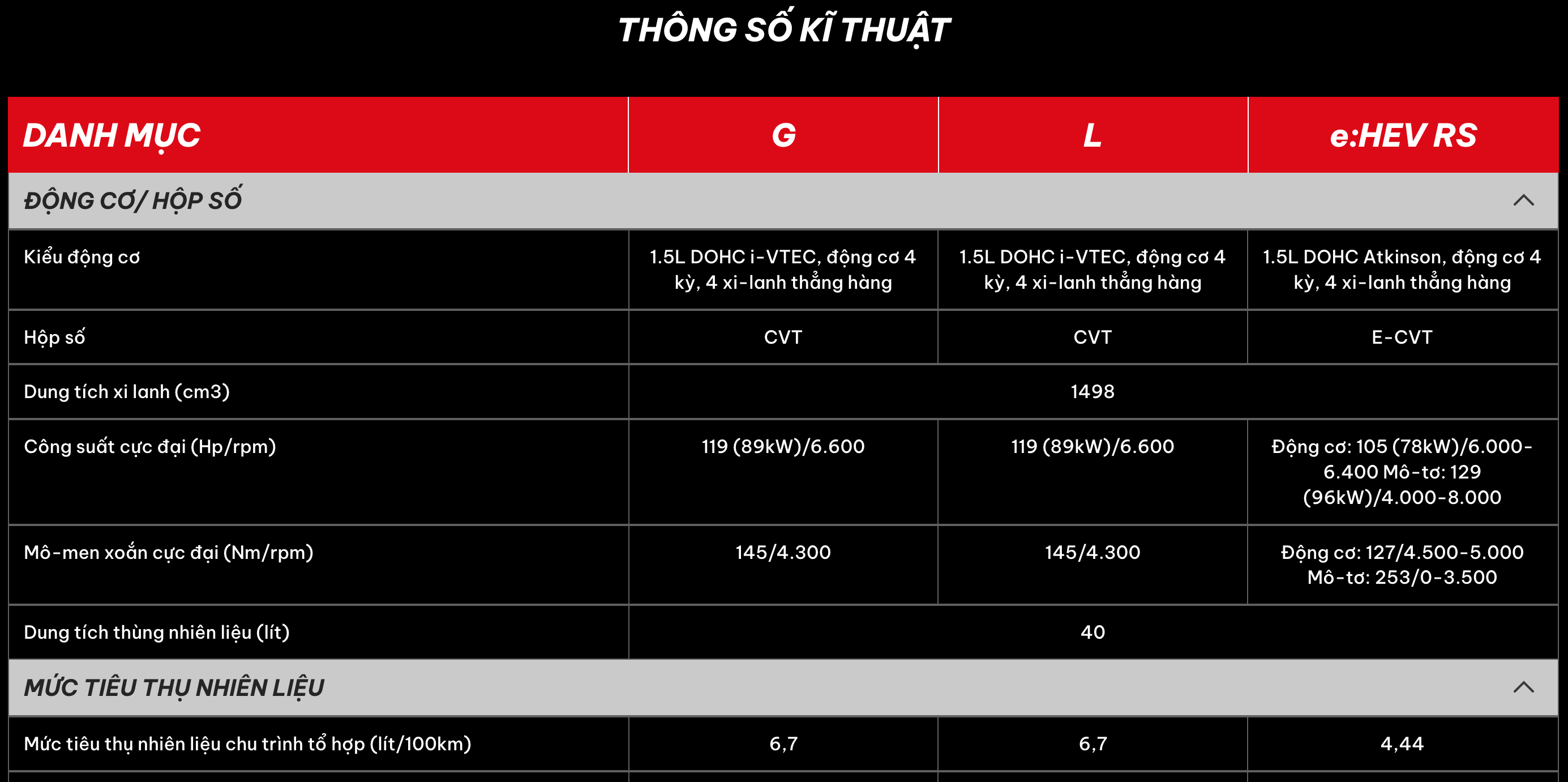 Tên Xe Honda HR-V G Honda HR-V L Honda HR-V e:HEV RS