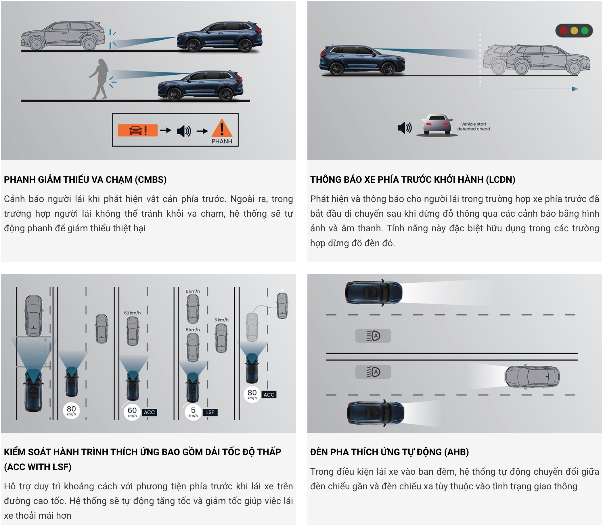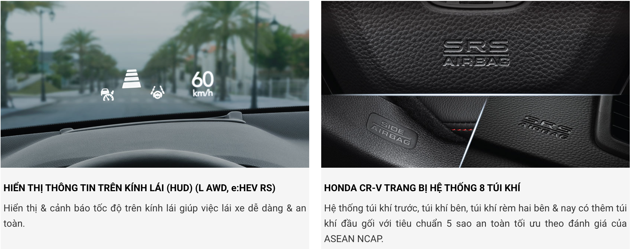 Hệ Thống Công Nghệ Hỗ Trợ Lái Xe An Toàn Tiên Tiến Honda SENSING Với hệ thống công nghệ thông minh hỗ trợ người lái vững vàng quan sát & xử lý mọi tình huống, Honda CR-V bảo đảm an toàn để bạn vững tâm chinh phục mọi cung đường. *Các tính năng của Honda SENSING chỉ có vai trò hỗ trợ lái xe an toàn trong những điều kiện nhất định và không thể thay thế việc lái xe của người sử dụng. Hãy luôn chú ý quan sát và chủ động lái xe an toàn. Chi tiết về tính năng của Honda SENSING, vui lòng tham khảo trong Hướng dẫn sử dụng xe.